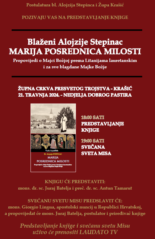 Knjigu ćete si moći nabaviti odmah po završetku svete mise ispred crkve po promotivnoj cijeni. A ukoliko niste u mogućnosti doći na promociju – knjiga će uvijek biti u prodaji u Biblioteci Spomen-doma bl. Alojzija Stepinca u Krašiću. Hvala!